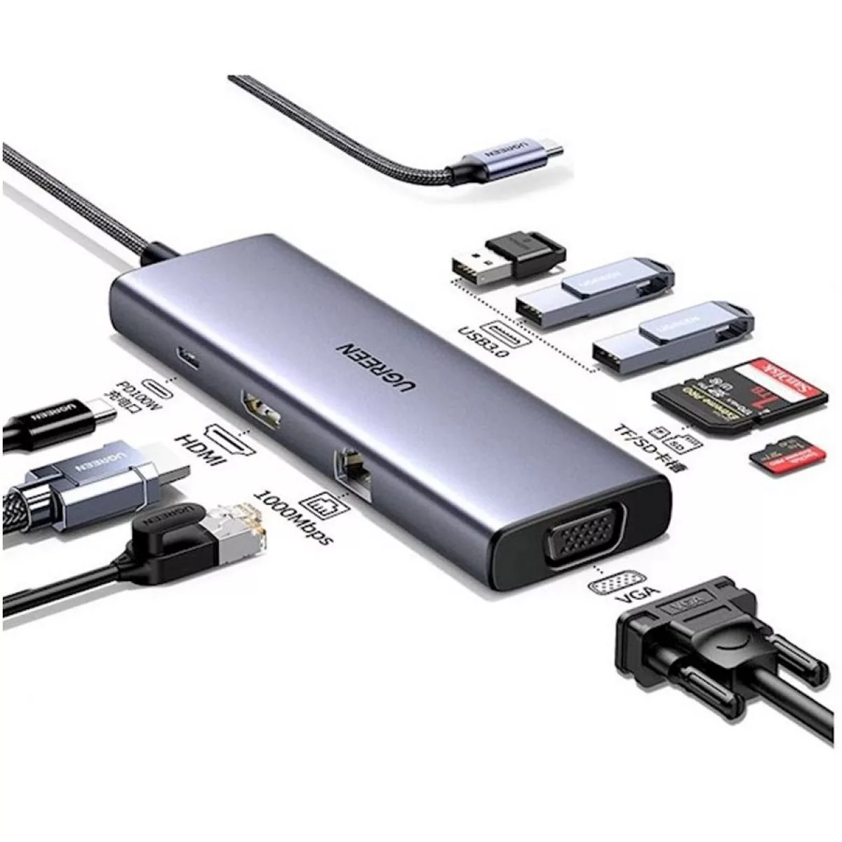 Hub Ugreen 4k Tipoc Usb 9 en 1/hdmi/vga/rj45/sd/pd