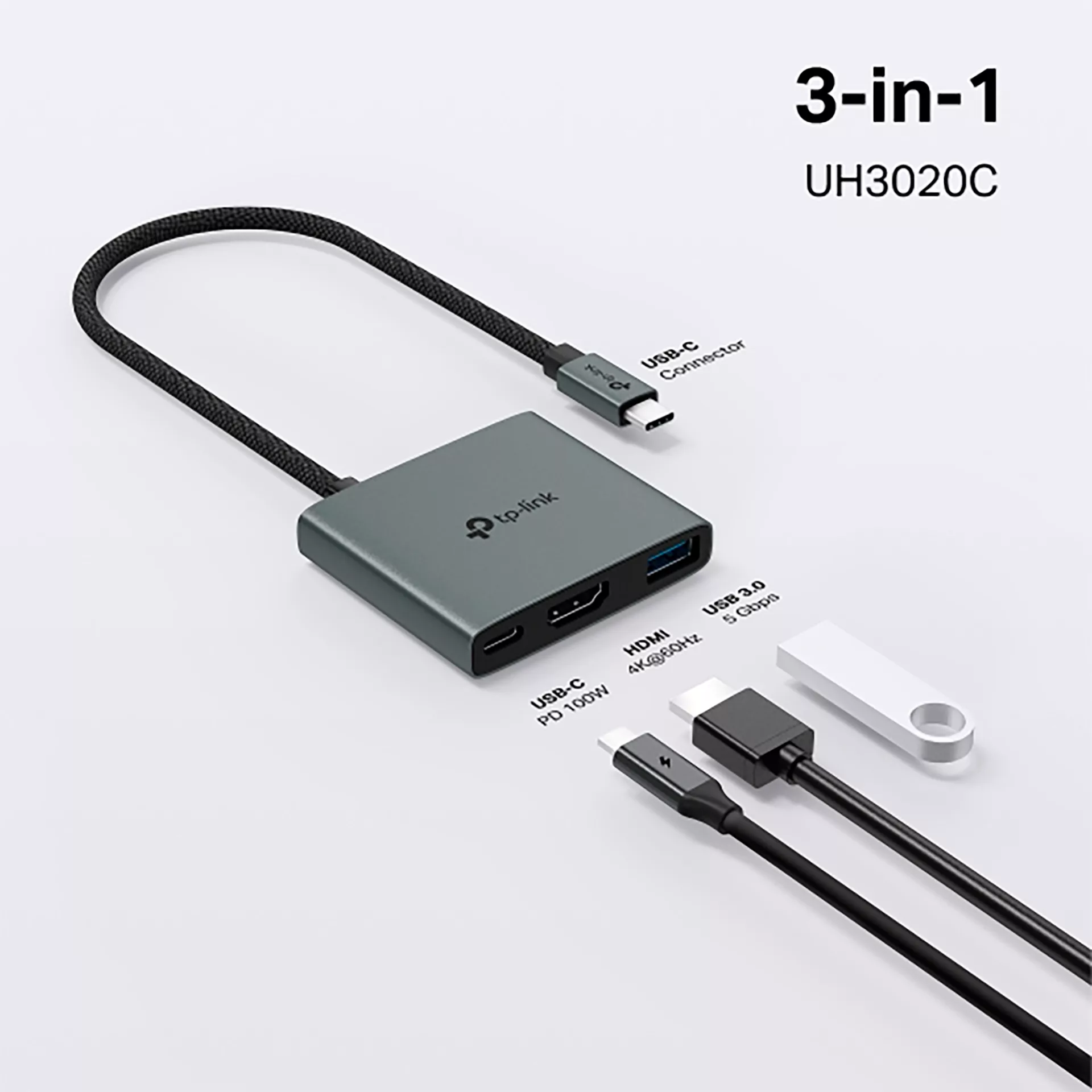 Hub 3 en 1 USC C. UH3020C convierte un único puerto USB C en 3 puertos con: 1 puerto HDMI 4K a 60Hz , 1 puerto 100 W Power Delivery y un puerto USB A.