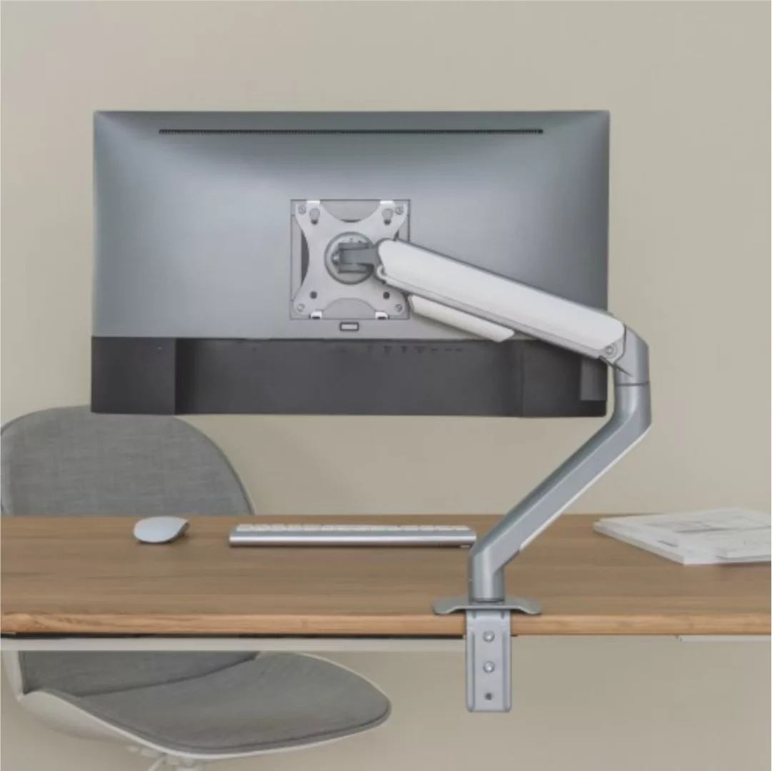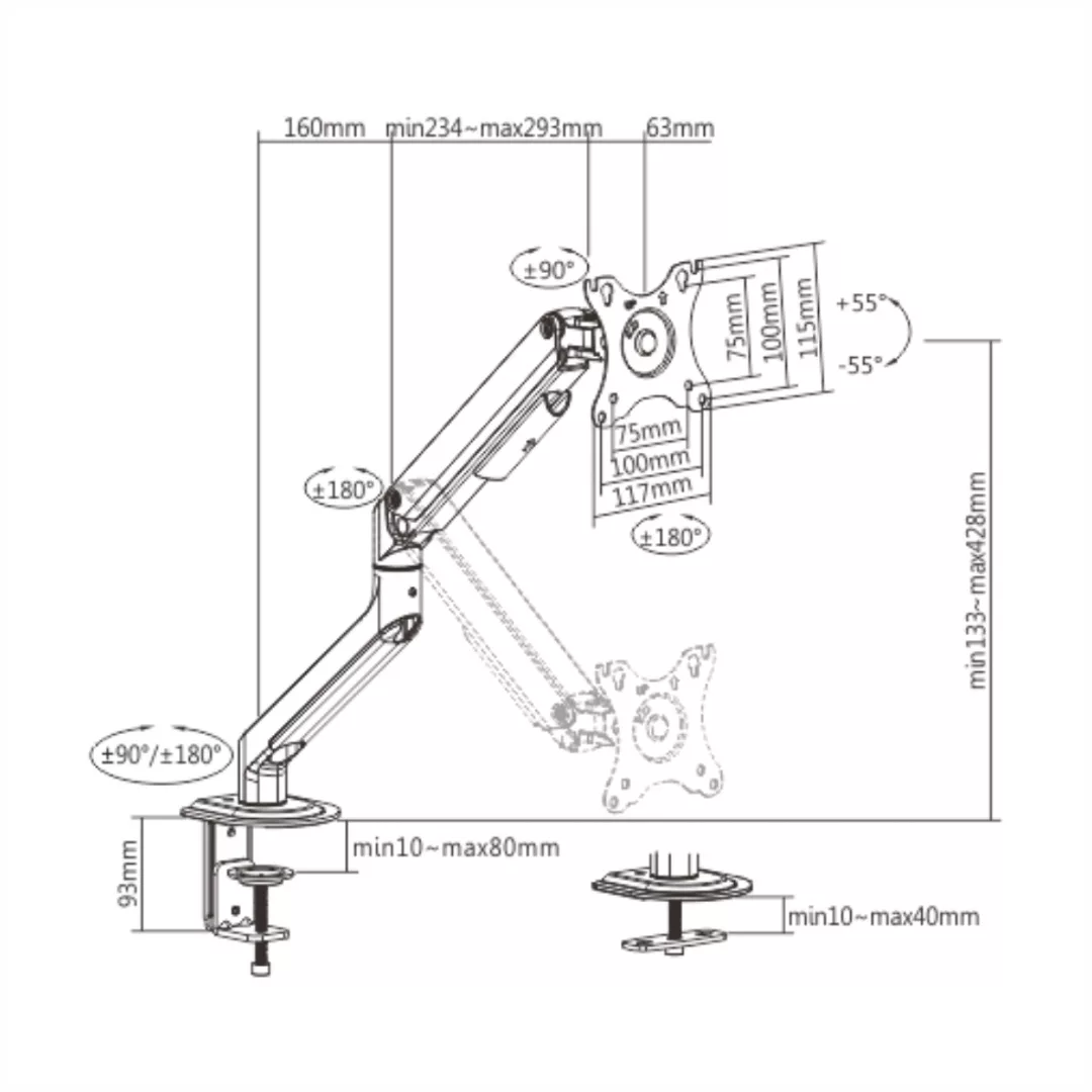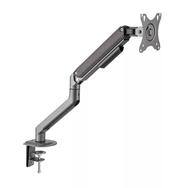 Soporta hasta 9Kg Para pantallas de entre 17" a 32" Medidas de vesa: 75x75 , 100x100 mmMateriales: Acero, plástico y aluminioColor: Gris espacialAngulo de inclinacion: +55º / -55ºAngulo de giro: +90º / -90º