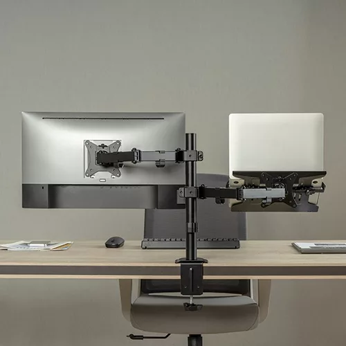 Materiales: Acero y plastico Color: Negro mate Medidas: 959 x 319 x 561 mm Pantalla: 17" - 32" Soporte de peso: 9 Kg Notebook: 10" - 15.6" Soporte de peso: 4 Kg Rango de inclinacion: +- 45º Rango de giro: +- 90º Extension completa del brazo: 376 mm 2 modelos de sujetador Altura del poste: 407 mm Gestor de cables Vesa: variable